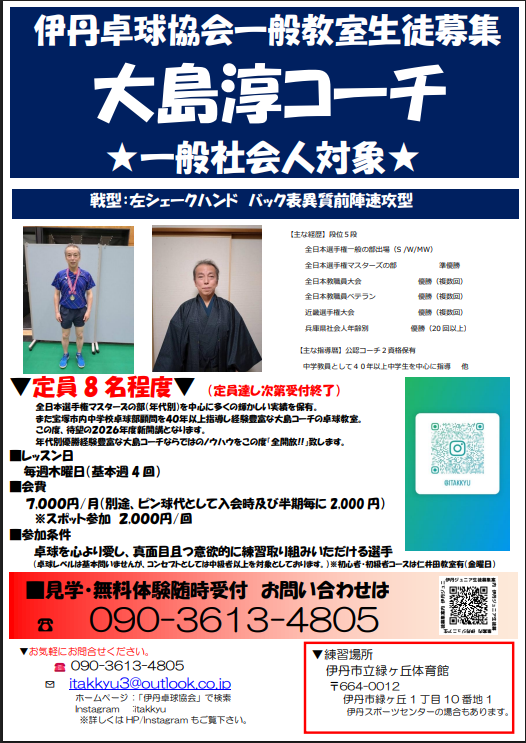 お知らせ 2025.12.18 伊丹卓球協会特別教室生徒募集→林正偉コーチ教室(小学生 中学生 高校生対象)詳細蘭